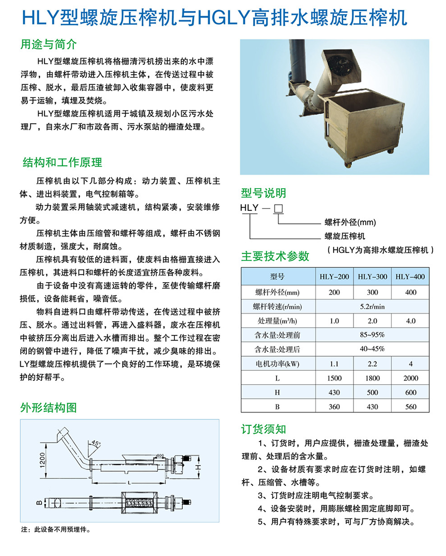 HLY型螺旋壓榨機與HGLY型高排水螺旋壓榨機